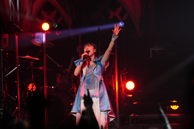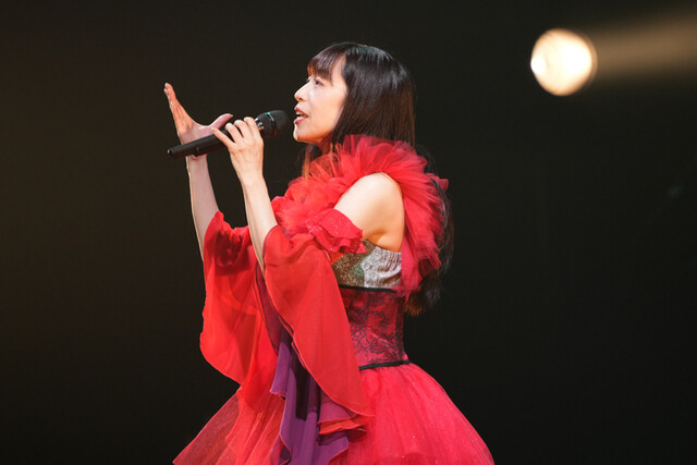 ステージが真っ赤な照明に照らされると、赤いドレスに早着替えを済ませた彼女が舞台奥から姿を現し、「-赤い華- You’re gonna change to the flower」を披露。この真紅のドレスは『KING SUPER LIVE 2024』で着用していた衣装でもあり、その鮮やかなインパクトから記憶に残った方も多かったのではないだろうか。ハイトーンボイスを響かせると場内からひときわ大きな拍手が起こった。ここからは「Everlasting Train -終わりなき旅人-」「空をあきらめない」など、力強い歌声を響かせる楽曲が続いた。そんな彼女に寄り添うように唸るベースや身をよじるようなサウンドを奏でるギターなど、バックバンドのアツくほとばしる演奏が光る。