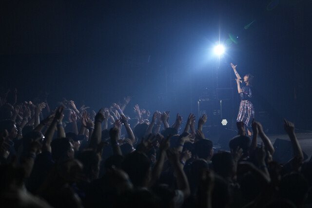 「だめよ!だめよ!だめよ!!」「目を覚ませ、男なら」など定番曲が続き、「せつない笑顔」では打って変わってバラードの流れになるも、そこにはどんな曲でも息ぴったりに応えるファンの姿が。ほんの些細なやり取りだ が、彼女がライブを重ねる度に強くなっていったファンとの絆を感じずにはいられない。「246」「届けたい想い」と続くと、舞台下手へと姿を消した。その間はファンの皆でアウトロを歌い上げ、繋いでいく。バンドの演奏も、ギター、ベース、そしてドラムとひとつずつ消えていき、最後は客席の歌声だけに。まさに冒頭で彼女が言っていたように、”皆で作るライブ”なのだ。