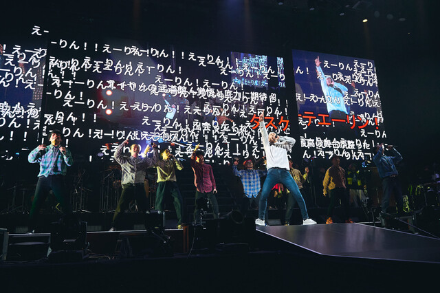 次のブロックでは早速『おジャ魔女カーニバル!!』が流れる。チームが本格的な活動をスタートさせたタイミングの代表作でもあり、平成初期のアニソンながら、令和のいまでもMAD映像としてインドダンスが大流行するなど、さまざまなバズりを残してきた名アニソンだ。続けてアニメ「てーきゅう」オープニングより「ファッとして桃源郷」を、さらに新作ステージとなる「Help me,ERINNNNNN!!」を披露。インターネットで育った人間なら一度は目にするであろう「東方Project」というゲーム作品の二次創作楽曲で、