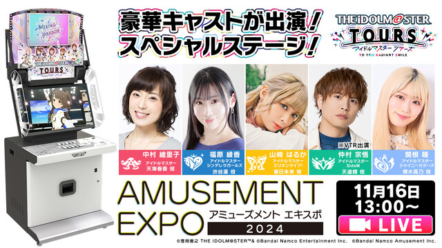 「アイドルマスター TOURS」公式YouTubeチャンネルでは、アミューズメントエキスポ2024で実施したステージ生配信のアーカイブを2024年11月24日(日)23時59分まで公開。また、視聴者プレゼントキャンペーンを実施する。出演キャストの中村 繪里子(天海 春香役)、福原 綾香(渋谷 凛役)、山崎 はるか(春日 未来役)、仲村 宗悟※(天道 輝役)、関根 瞳(櫻木 真乃役)それぞれのサイン入り「アイドルマスター TOURS」のカードを抽選で合計10名にプレゼント。
