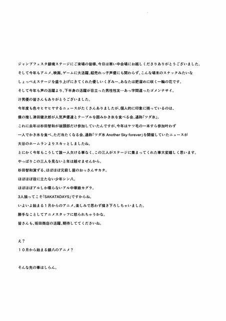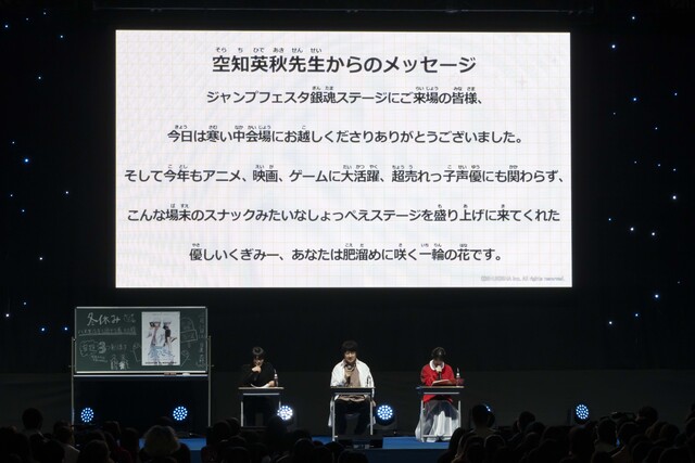 さらに、ファン投票が実施された「キャラクター人気投票」「感動した“〇〇篇”」「爆笑した“第〇訓”」の結果を発表。キャラクター人気投票は上位20位までが原作者の空知先生の描き下ろしとともに紹介され、「新八は今回も8位だった」など大いに盛り上がりました。
