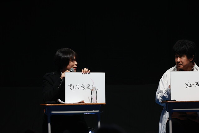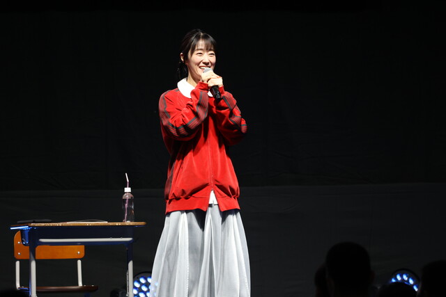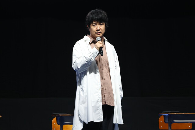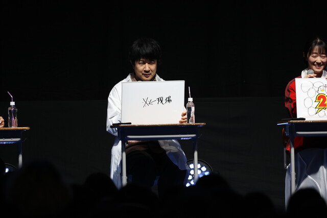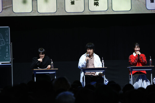 イベントのオープニングでは、登壇者の3人が『3年Z組銀八先生』でのキャラクターである坂田銀八・志村新八・神楽として影ナレーションを担当。銀八からの「はーい、皆さんが静かになるまで3分かかりました。」という学校の先生あるあるセリフで会場を沸かせたあと、教室をイメージしたステージに3人が登場しました。ステージ上では阪口さんが日直として進行役を務め、「起立!礼!着席!」の号令でイベントがスタートしました。