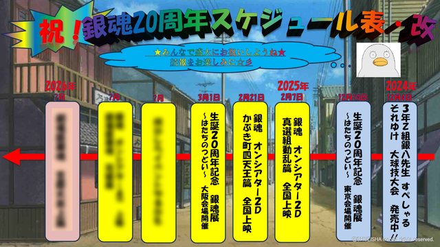 さらに、今後の20周年の展開を紹介とのことで、スクリーンに「銀魂20周年スケジュール表・改」というクソダサい展開プランが記載されたスケジュール表が公開され、2025年2月7日(金)から「銀魂オンシアター2D 真選組動乱篇」が、2月21日(金)から「銀魂オンシアター2D かぶき町四天王篇」が全国の映画館で3週間の限定上映されることなどが紹介されました。