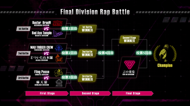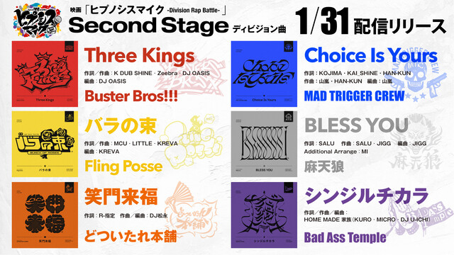 16曲にも及ぶ新曲が登場することでも話題となっている本作だが、劇中で繰り広げられるファイナルディビジョン・ラップバトルの二回戦にあたるSecond Stageに関する詳細が発表された。イケブクロ、ヨコハマ、シブヤ、シンジュク、オオサカ、ナゴヤ・ディビジョンの6ディビジョンのうち、First Stageを勝ち抜いた3ディビジョンのみが進出できるSecond Stageでは、3ディビジョンがそれぞれの新曲をパフォーマンスし、熱いバトルを繰り広げることが明らかに。