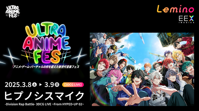 株式会社NTTドコモ(以下、ドコモ)が株式会社IMAGICA EEXと共催で、2025年3月8日(土)・9日(日)の2日間、ぴあアリーナ(神奈川県横浜市)にて開催する『Lemino presents ULTRA ANIME FES 2025(以下ULTRA ANIME FES)』において、ヒプノシスマイクが【3DCG LIVE】で〝初〟披露となる「ヒプノシスマイク -Division Battle Anthem- +」をパフォーマンスすることが決定。
