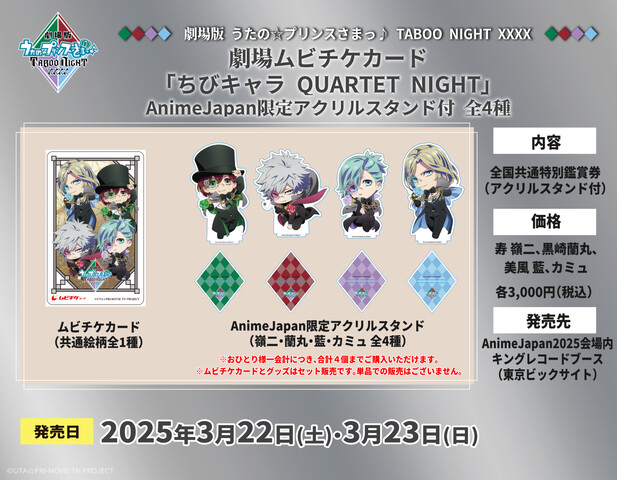 そして、2月21日(金)からは、劇場ムビチケカード「ちびキャラ QUARTET NIGHT」全1種・数量限定特典クリアファイル付きが上映予定劇場(一部劇場を除く)と通販サイトにて販売が決定。また、3月22日(土)、3月23日(日)に開催されるAnimeJapan2025(東京ビックサイト)のキングレコードブースにて、会場限定でかわいいちびキャラQUARTET NIGHTのアクリルスタンドが付く劇場ムビチケカードの販売も。さらに、本作品の公開を記念して、3月7日(金)より3週間、劇場での『劇場版 うたの☆プリンスさまっ♪ マジLOVEキングダム』『劇場版 うたの☆プリンスさまっ♪ マジLOVEスターリッシュツアーズ』2本立てでのアンコール上映の開催が決定。こちらは、週替わりの来場者特典配布に加えて、本編上映後、お客様によるスクリーンの写真撮影を行えるフォトセッションコーナーもあるぞ。