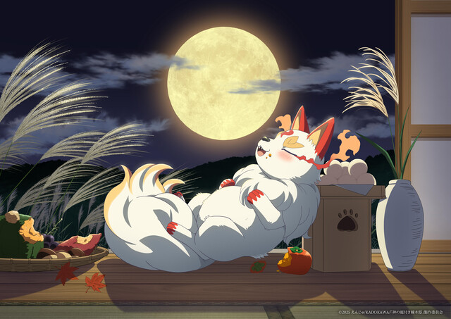 シリーズ累計50万部を突破、原作は「小説家になろう」「カクヨム」にて連載中、電撃の新文芸(KADOKAWA)より発刊の『神の庭付き楠木邸』。今年の十五夜に合わせて、描きおろしのお月見ビジュアルを公開。満月の輝く縁側で、おなかいっぱいになり寝てしまっている山神が可愛らしい一枚になっている。