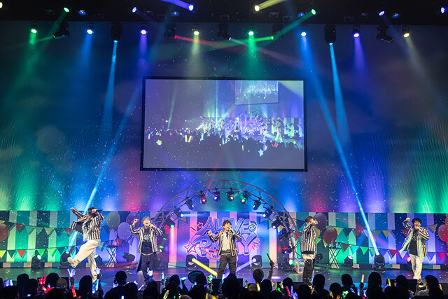 カウントダウンと同時に、イベントビジュアルと同じストライプ柄のジャケットを身につけた豊永さん、小野さん、古川さん、村田さん、沢城さんが登場し、疾走感あふれるバンドサウンドが特徴的なユニット曲「LIFE IS AMAZING」が流れ、幕が上がります。