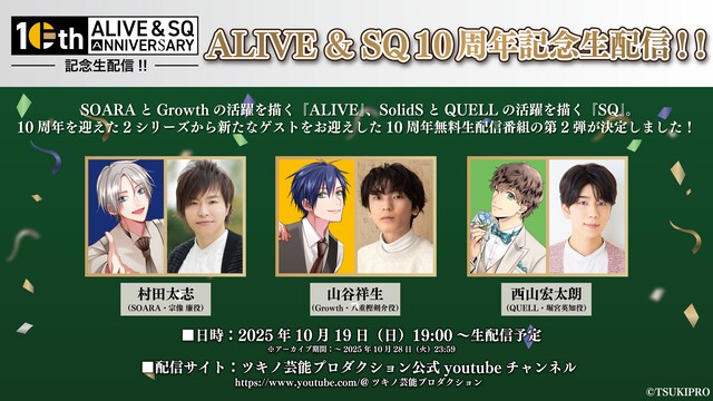 SOARAとGrowthの活躍を描く『ALIVE』、SolidSとQUELLの活躍を描く『SQ』。10周年を迎えた2シリーズから新たなゲストをお迎えした10周年無料生配信番組の第2弾が決定しました!